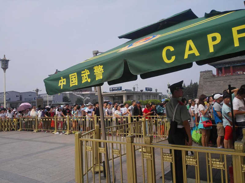很多散客 认为自己游览故宫和广场很容易, 其实不然, 看看广场上安全检查的队伍, 烈日之下, 是多么的受罪。